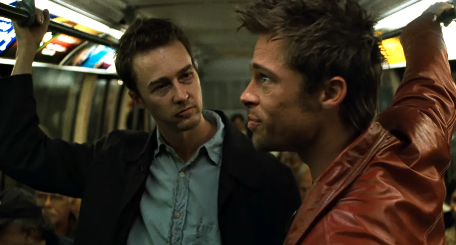 In Fight Club, Edward Norton interpreta il Narratore, un uomo comune e insoddisfatto della sua vita, prigioniero di un lavoro monotono e di una società consumistica che lo ha reso schiavo. Afflitto dall’insonnia e da una profonda crisi esistenziale, inizia a frequentare gruppi di supporto per malati terminali, trovando un temporaneo sollievo alle sue sofferenze interiori. Ma la sua vita cambia radicalmente quando incontra Tyler Durden, un venditore di sapone anarchico e carismatico, interpretato da Brad Pitt.